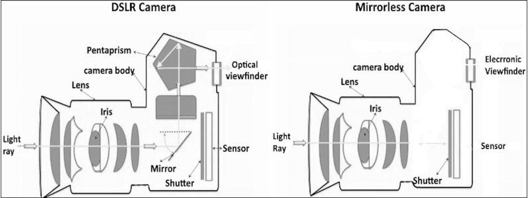 Mirrorless cameras and DSLRs have a crucial difference in their process: while mirrorless cameras capture images without the use of a mirror in the camera body, DSLRs use mirrors to reflect images into viewfinders. In place of this mirror, mirrorless cameras often utilize electronic viewfinders (EVF) to display images digitally.